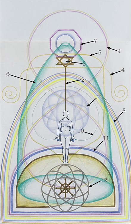 7. 영적 중심위로 광배가 시작된, 꽃병의 입구라 볼 수 있는 부분에 팔각형의 에너지체와 원형의 에너지장이 드러났다. 팔각형은 팔방운영체와 '운영'이라는 의미에서 같은 작용을 한다고 할 수 있지만 도형으로써 닫혀있으므로 물질적인 운영이다.