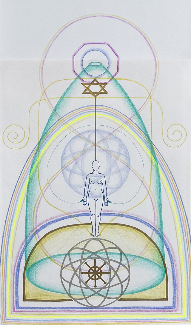 2. 영적 중심선Spiritual Centerline이다. 영적 중심선은 일반적으로 머리에서 위쪽으로 향하며 끝나는 지점이 영적 중심이 된다. 영적 중심선은 인체와 영적 중심의 연결성을 의미한다.