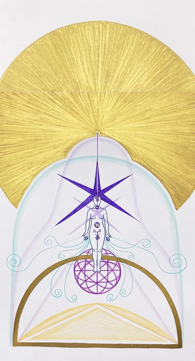 신성화에서 각각의 차크라 정보는 잘 드러나지 않는 편입니다. 이 신성화에는 의뢰인의 차크라 정보가 잘 드러났는데요, 특히 가슴의 차크라에서 빛의 상징이 '오방'이 드러난 것은 이 분의 가슴이 빛으로 운영되고 있다는 것을 말해준다고 생각합니다. 손에서 뻗어나오는 나선 에너지 또한 이 분이 능력적인 면에서 힘이 있다는 것을 말해주고 있으며 영적 중심에서 퍼져나오는 금빛 에너지 발산은 이 의뢰인 분이 영적인 방향으로 강하게 나아가고 있다는 것을 상징적으로 보여주고 있다고 할 수 있습니다. 차크라 상징에서 다른 부분보다 가슴에서 빛이 드러난 것은 매우 중요한 것입니다. 눈을 감아도 앞이 보인다거나 세상에서는 볼 수 없는 형형색색의 빛을 본다거나 하는 신비체험을 많이 하시는 분이신데 그 체험을 넘어 높고 깊은 영적인 자리에 가시길 기원합니다.
