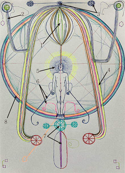 8. 몸 주변을 하늘,남색,주황,보라,초록색의 둥근 에너지 장이 크고 강하게 감싸고 있다. 현실적으로 매우 강하고 건강한 상태. 원 안에는 희미하게 표현했지만 가득 채우는 운영의 상징과 세상에 좋은 영향을 주는 상징이 나타났다.