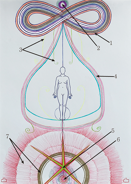 4. 영적 중심에서 시작된 광배光背Halo가 여러 겹의 에너지, 특히 분홍색의 에너지들로 중첩되어 드러났다.