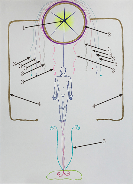 4. 영적 중심에서 나온 금색의 에너지가 헤르만 헤세의 현실 영역까지 내려온다. 그의 영적 이상이 현실의 버팀목이다.