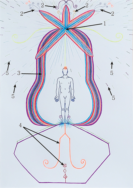 1. 영적 중심에서 하늘색의 빛의 상징이 드러났고 분홍, 주황, 하늘색으로 4겹의 층을 이루고 있다.