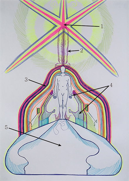 1. 영적 중심에 빛의 상징이 드러났다. 3겹의 거대한 빛의 상징 중심으로부터 노란색의 에너지가 넓게 방사되고 있고 초록색의 우회전하는 에너지가 둘러져있다.