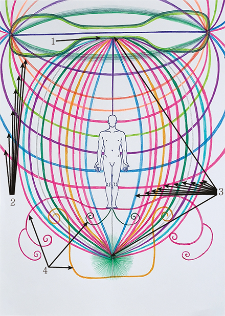 2. 영적 중심 양 끝에서 갖가지 색채의 에너지 흐름이 자기장처럼 퍼지는데 여동빈 조사祖師의 영역까지 펼쳐진다.