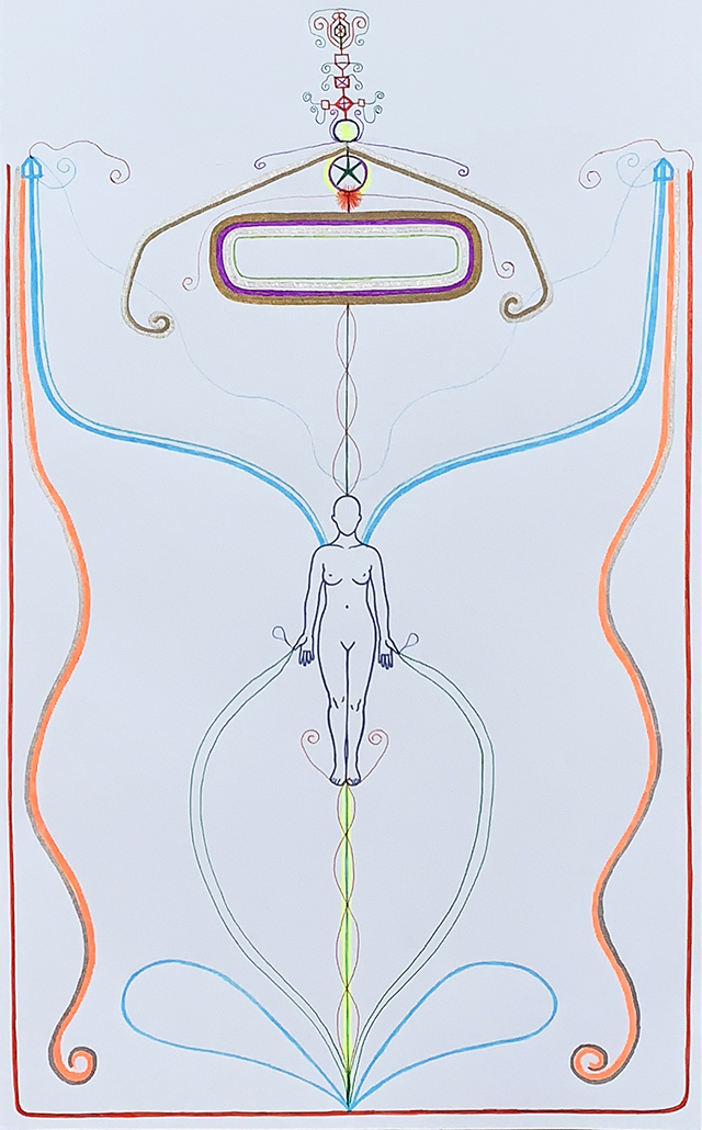 5. 좌,우측 상단에 집 모양의 상징이 드러났는데 하늘색 에너지의 흐름이 헬렌 니어링의 어깨와 머리로 흐름이 이어지고 있고, 주황색과 은색의 안테나는 아랫쪽 현실 영역까지 내려와있다.