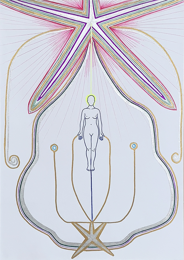 1. 영적 중심에서 은색과 금색을 포함한 7겹의 층을 이룬 빛의 상징이 드러났다. 그리고 분홍색의 빛이 이중으로 방사되고 있다.
