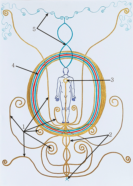 1. 발에서 금색의 나선Helix들이 다양하게 펼쳐져나왔다. 그 중 하나는 영적 영역으로 높이 솟아오른다. 영적 영역으로 솟아 오른 나선은 안테나 역할을 한다.