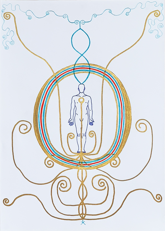 2. 발 아래로 금색의 현실 중심선이 내려가고 이중 나선Double Helix가 교차한다. 블루그린색의 작은 영적인 빛의 상징으로 닿는다.